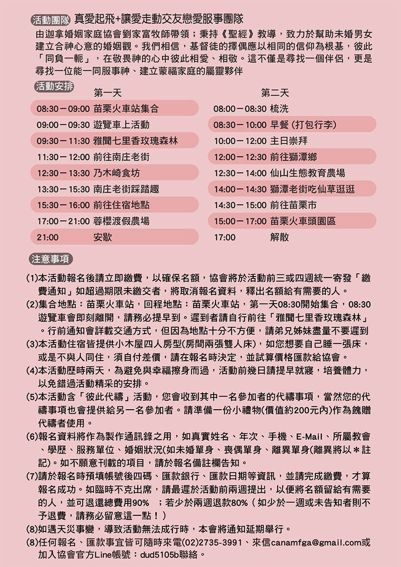 (8)任何報名、匯款事宜皆可隨時來電(02)2735-3991、來信canamfga@gmail.com或加入協會官方Line帳號:dud5105b聯絡。
